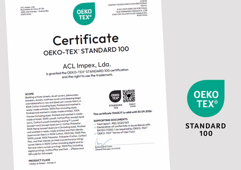 No setor da roupa de cama, esta certificação confirma que tecidos, fios, corantes e acessórios foram analisados segundo critérios rigorosos, assegurando que o produto final é seguro para contacto direto com a pele. Para retalhistas, compradores profissionais e marcas, o OEKO-TEX® Standard 100 tornou-se um indicador relevante de qualidade, transparência e responsabilidade na cadeia de produção têxtil.